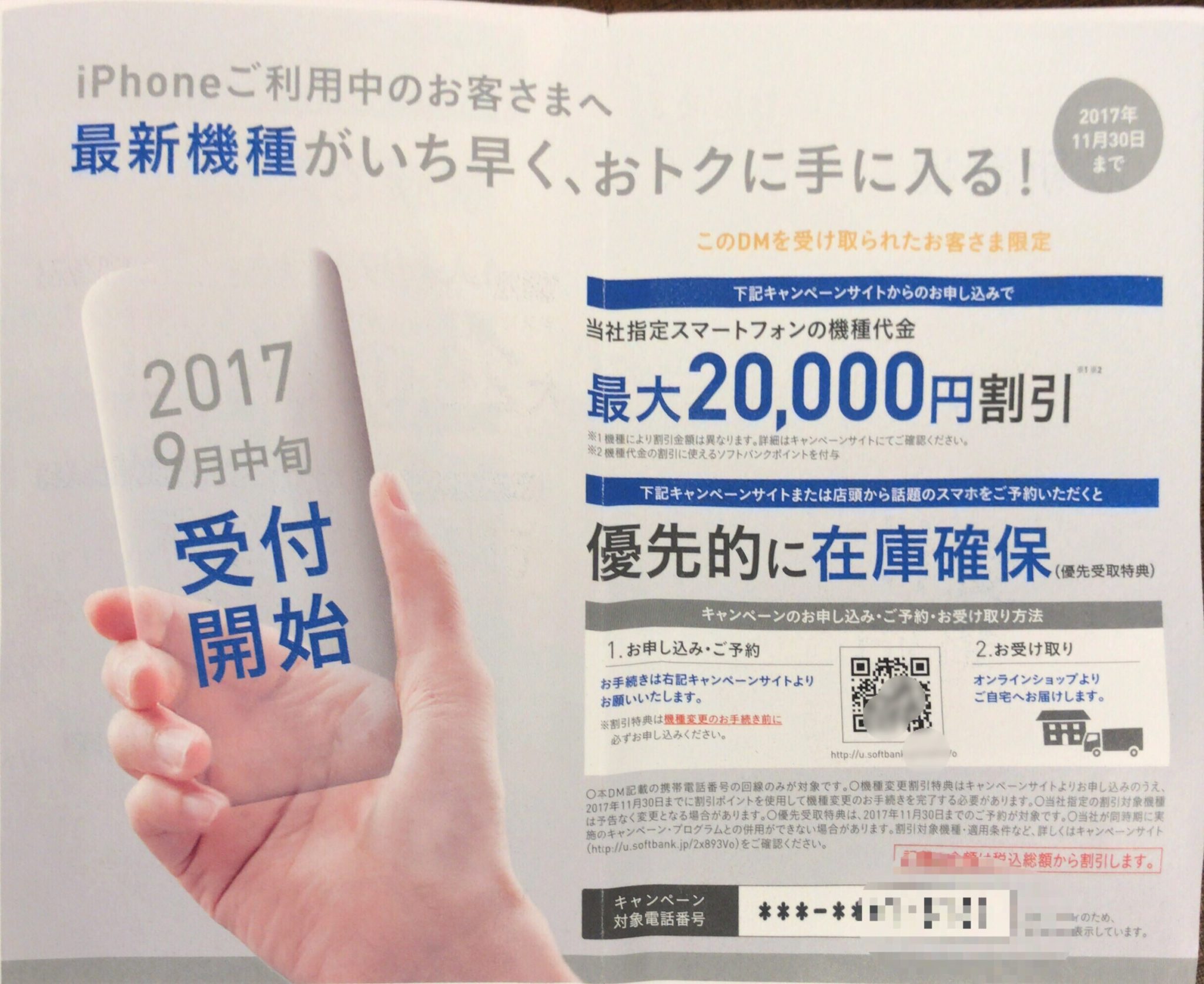 ソフトバンクからの優待ハガキ。ポイント+新機種在庫の優先割当・・・。