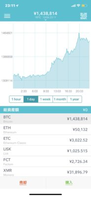 こちらは、直近24h間のビットコインチャート。
