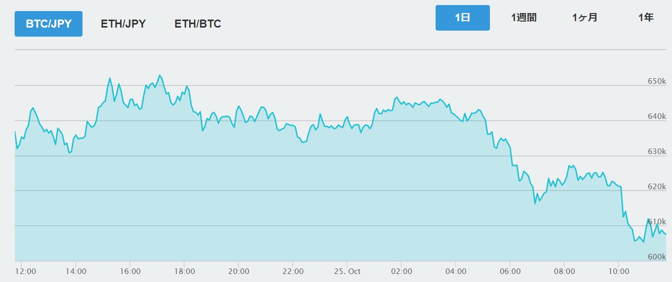 数日前は70万円に到達しそうだったのに、昨日は64、5万円に下落、そしてこの24時間で60万円割りそうなぐらいまで下落していますね。