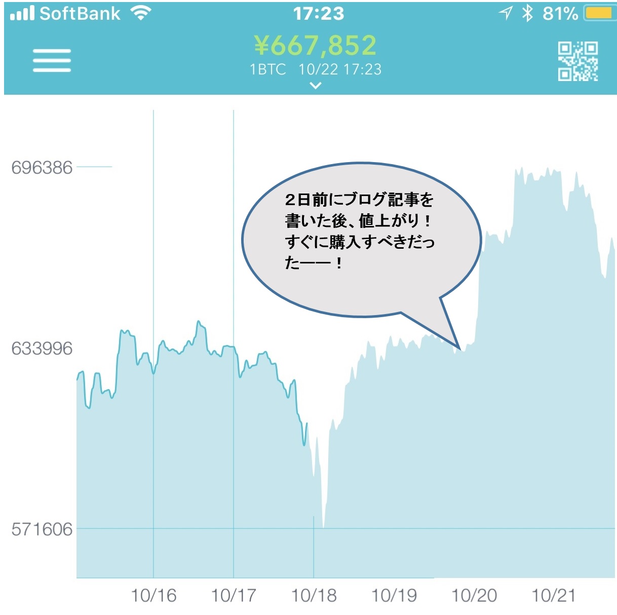 ちょうど2日前に記事をアップ後に、ビットコインの値段が6万円ほど上昇・・・。