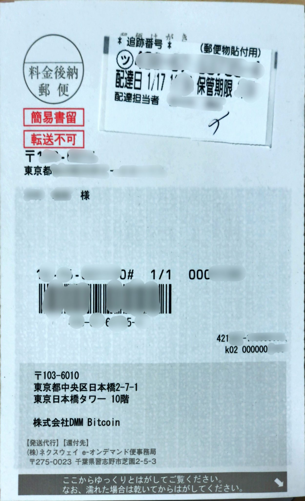 DMMBitcoinからハガキが1枚郵送されてきた