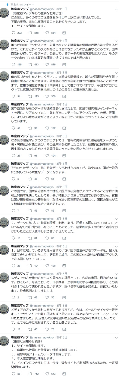 5.ドメインにつきましては、今後、類似サイトが出る恐れがあるため、一定期間保持します。— 破産者マップ (@hasanmaptokyo) 2019年3月18日