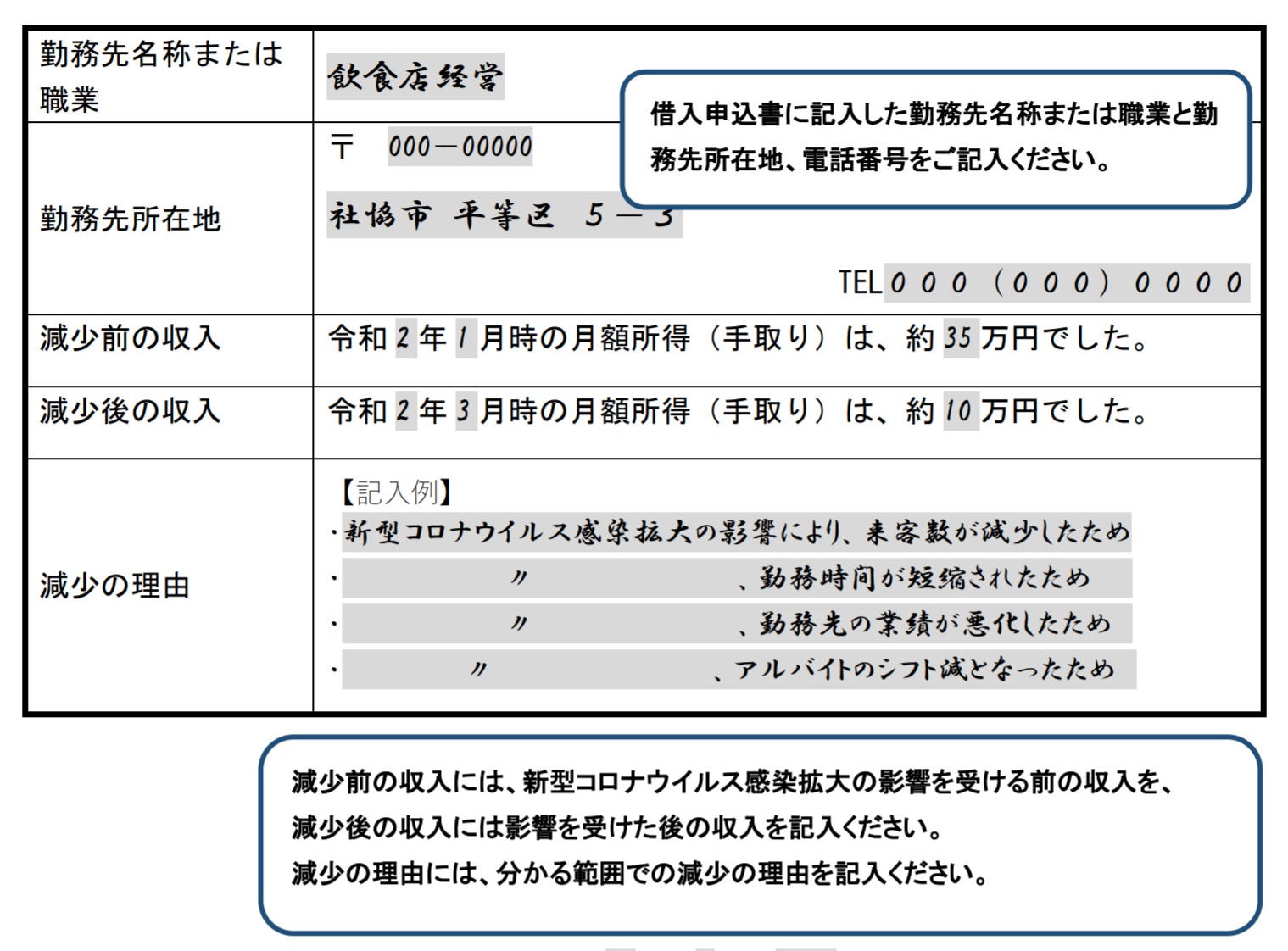 緊急小口資金の貸付に必要な資料は「収入の減少状況に関する申立書」を含めて4枚存在するけれど、どれも記入サンプルが用意されていて、サンプル通りに書いていけばすぐに資料作成が可能です。